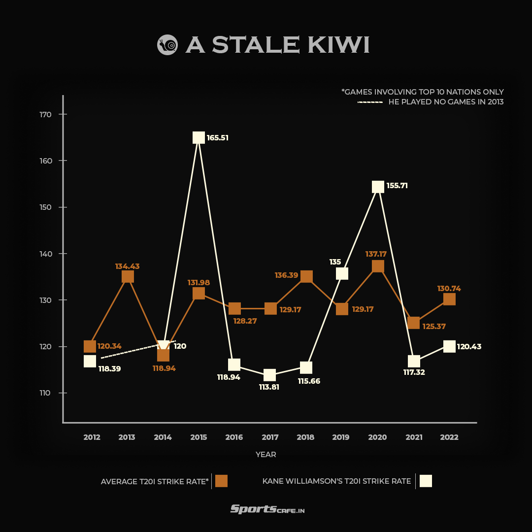 Williamson has never had great numbers throughout his T20I career. While his career average of 32.73 makes one sit up and take notice, his strike rate of 123.46 makes the same person sink ever deeper into the same seat. Nevertheless, such returns were considered good around the time the Kiwi made his debut a decade ago but even though the game has evolved significantly since, the batter’s statistics have failed to catch up with the trend. Anchors are no longer limited to just biding their time at the crease and hoping the batter at the other end deals all the damage. They now also carry the onus of accelerating themselves when the innings approaches the death.