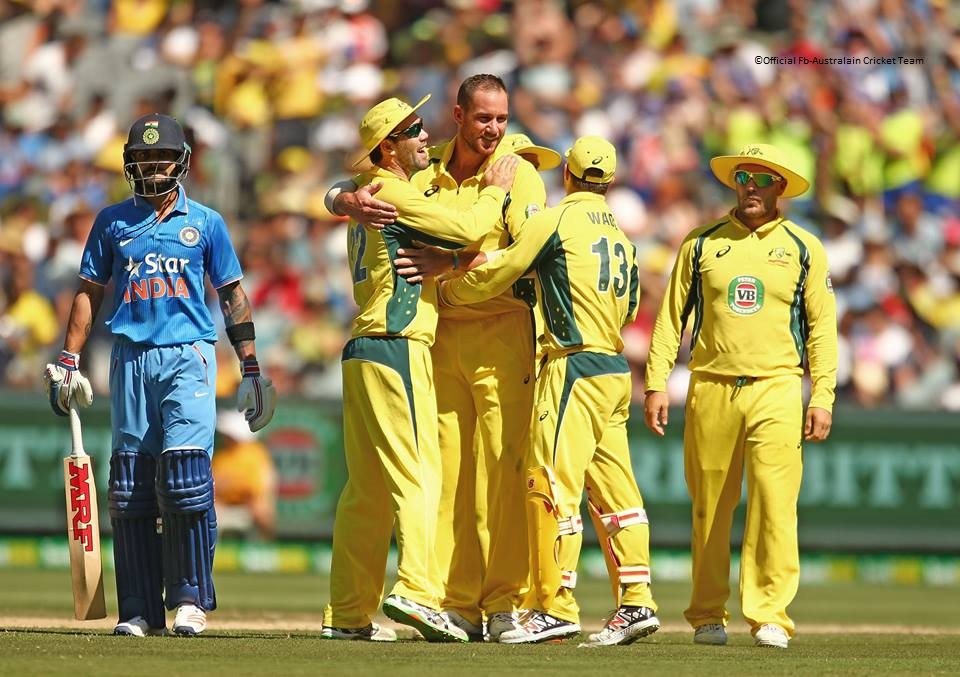 With India needing quick runs in the last ten, Rahane’s attempts to accelerate brought his downfall with the Mumbai cricketer falling for 50 off 55 balls to a brilliant team catch at the long leg boundary from Smith and Maxwell. Kohli followed his partner shortly, ending his brilliant run-a-ball 117-run innings smashing the ball straight at Bailey to gift Hastings his third wicket of the match. For the third time in the series, India’s acceleration came a little too late as they scored 88 runs in the last ten overs losing four wickets to finish the innings at 295/6.