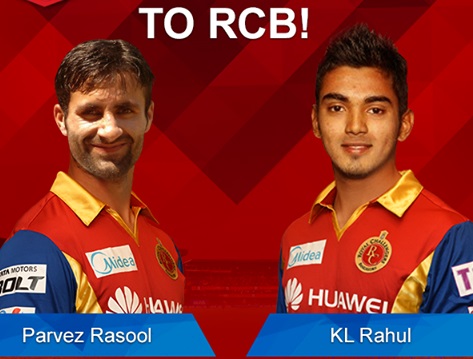 Karnataka batsman KL Rahul and Jammu and Kashmir all-rounder Parveez Rasool will be seen in the red and gold jersey of Royal Challengers Bangalore in the upcoming 2016 edition of the Indian Premier League after moving from Sunrisers Hyderabad to the Bengaluru side in the IPL trading window today.
