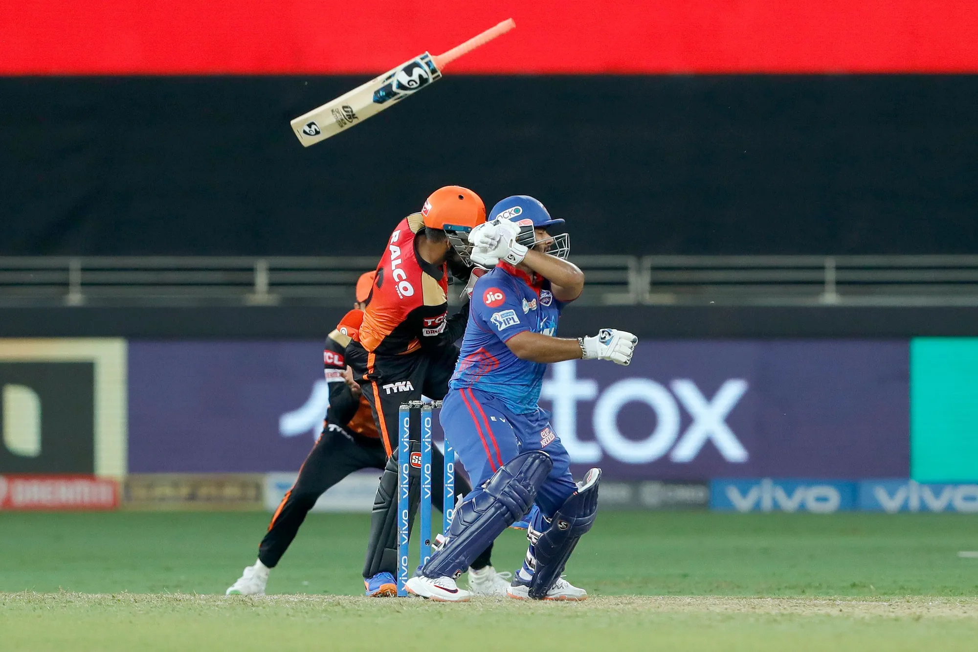 The Capitals, chasing a victory target of 135, were placed strongly at 97/2 in the 15th over, when Pant tried to take on Rashid for a boundary. The ball, pitched on the back of a length, skidded through wide outside off, and the left-hander went for a cut, only to lose his bat which went flying away to the mid-wicket region.