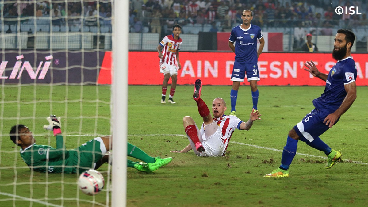 Chennaiyin midfielder Raphael Augusto provided the visitors with the lead in the 26th minute of the game after a series of embarrassing mistakes by the Kolkata defenders. Left back Augustin Fernandes slipped while attempting a clearance and missed the ball completely. Augusto ran with the ball towards the goal, and skipped past Kolkata defender Arnab Mondal who missed his half-hearted tackle. Amidst all this chaos, Augusto kept his calm and slotted the ball past the onrushing Kolkata goalkeeper.
